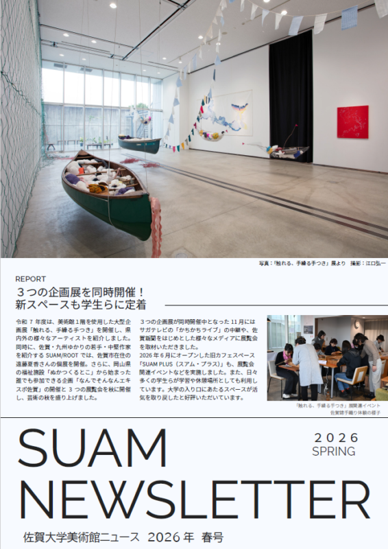 2026 04.05 日 お知らせ ニュースレター(2026年春号)を発行しました newsletter_2026_spring 前の記事 一覧に戻る SUAM ナビ! 今どんな展示してる? SUAMってなに? 最新情報が知りたい! 駐車場はある? 入館料/開館時間が知りたい 美術館を応援したい 美術館を利用したい 佐賀大学 開館10周年記念事業